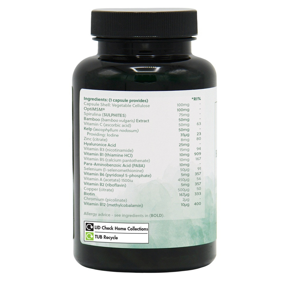 OptiMSM 100mg, Spirulina 75mg, Bambusz kivonat 50mg, Tengeri hínár (ascophyllum nodosum) 50mg ( 35ug jód tartalom), C-vitamin 50mg, Hyaluronsav 25mg, B3-vitamin (nikotinamid) 20mg, Cink citrát 15mg, PABA 10mg, B1-vitamin 10mg, B5-vitamin 10mg, B2-vitamin 5mg, Réz citrát 500mcg, A-vitamin (1500iu) 450mcg, Biotin 166.6mcg, Szelén 50 mcg, B12-vitamin 10 mcg, Króm pikolinát 2mcg