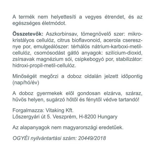Ez a Vitaking vitamin is válogatott, minőségi alapanyagokból készült. A sok természetes összetevő teszi igazán különlegessé ezt a készítményt. Minden egyes tabletta az 1000 mg C-vitaminon felül rengeteg citrus bioflavonoidot tartalmaz, valamint sok acerola és csipkebogyó található benne.