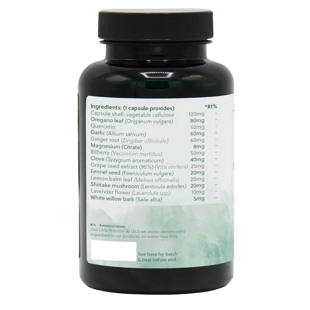 oregánó levél 80mg, quercetin 62mg, fokhagyma (organikus) 60mg, gyömbér gyökér 60mg, fekete áfonya 50mg, szegfűszeg 40mg, szőlőmag kivonat (95%-os) 25mg, édeskömény 20mg, citromfű levél 20mg, shiitake gomba (organikus) 20mg, levendula virág 10mg, magnézium citrát 8mg, fehér fűzfa kéreg (organikus) 5mg