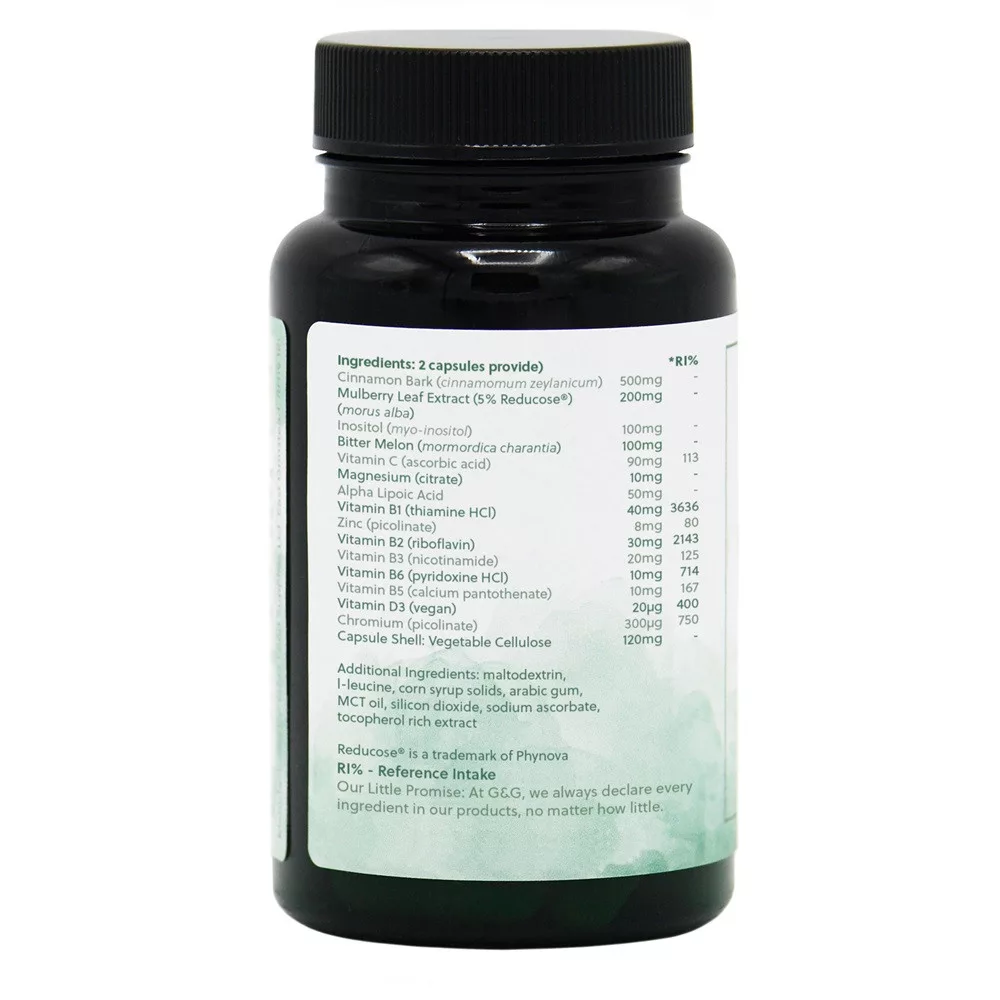 fahéj kéreg 500 mg, eperfalevél kivonat (5%-os redukóz) 200 mg, myo-inozitol 100 mg, keserű dinnye 100 mg, C-vitamin 90 mg, magnézium (citrát) 10 mg, alfa-liponsav 50 mg, B1-vitamin 40 mg, Cink (pikolinát) 8 mg, B2-vitamin 30 mg, B3-vitamin (nikotinamid) 20 mg, B6-vitamin 10mg, B5-vitamin 10 mg, D3-vitamin (vegán) 20 μg, króm (pikolinát) 300 μg