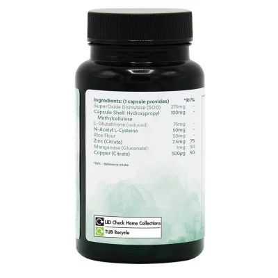 275mg szuperoxid dizmutáz enzim, 75mg l-glutation, 50mg N-acetil-L-cisztein, 7,5mg cink, 1mg mangán és 500µg réz