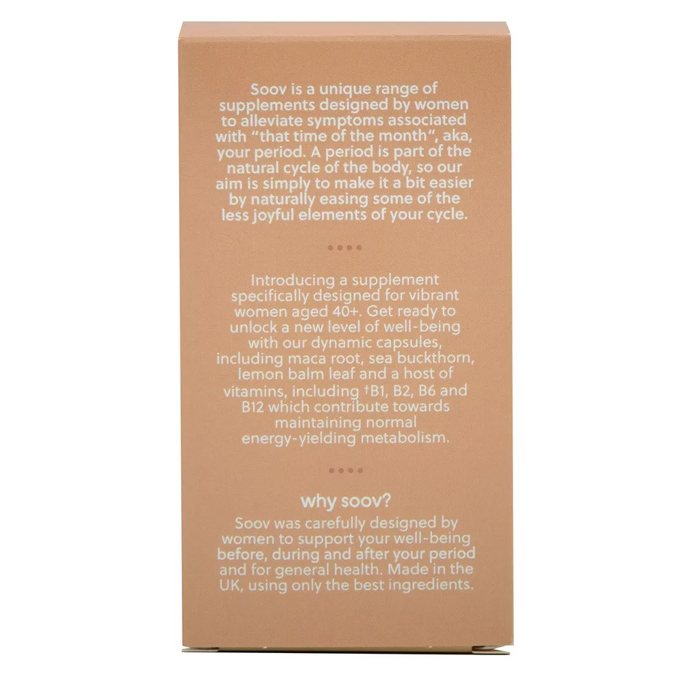 A Soov 40+ egy kifejezetten a perimenopauzális és menopauzális időszak előtt álló, illetve azt megélő, 40 év fölötti nők számára kifejlesztett étrend-kiegészítő, amely a megváltozott tápanyagigények kielégítésére fókuszál. Az élet „II. felvonásában” új energiát és kiegyensúlyozottságot nyújt a kivételes összetevők, például maca gyökér, tengeri homoktövis és citromfű révén. A B-vitamin komplex segítségével biztosítja a normál energiatermelést és a hormonális egyensúlyt, segítve, hogy a hölgyek ebben az új életszakaszban