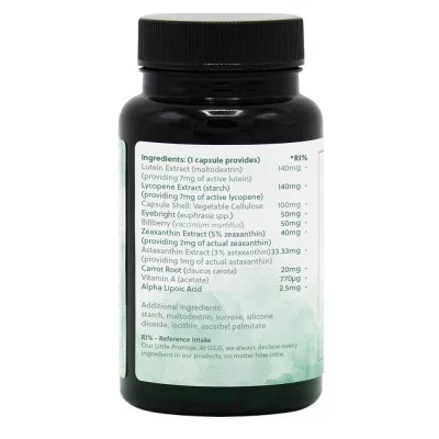 lutein kivonat 140mg ( 7mg aktív lutein tartalommal), likopin kivonat 140mg ( 7mg aktív likopin tartalommal), szemvidítófű (Euphrasia spp.) 50mg, fekete áfonya (Vaccinium myrtillus) 50mg, zeaxanthin kivonat 5%-os 40mg (2mg zeaxanthin tartalom), astaxanthin kivonat 3%-os 33,33mg (1mg astaxanthin tartalommal), vadmurok gyökérpor (Daucus carota) 20mg, alfa-liponsav 2,5mg, A-vitamin 770µg