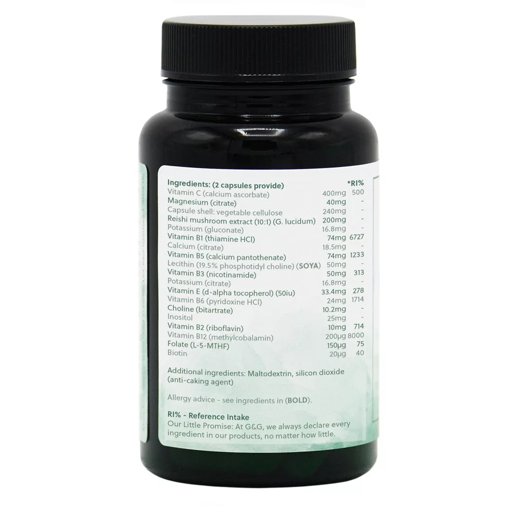 B1-vitamin 74mg, B2-vitamin 10mg, B3-vitamin (niacinamid) 50mg, B5-vitamin 74mg, B6-vitamin 24mg, Folsav (L-5-MTHF) 150μg, B12-vitamin (metilkobalamin) 200μg, kolin 11mg, inozitol 25mg, C-vitamin (kalcium aszkorbát) 400mg, E-vitamin 50NE, magnézium (citrát) 40mg, kalcium (citrát) 18,5mg, kálium (citrát) 17mg, kálium (glükonát) 17mg, biotin 20μg, lecitin por 50mg, reishi gomba kivonat 10:1 100mg