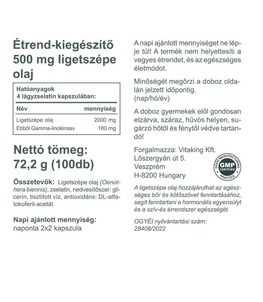 A Vitaking készítmény napi adagja (4 kapszula) 2000mg ligetszépe olajat tartalmaz, melyből Gamma-linolénsav 180mg.