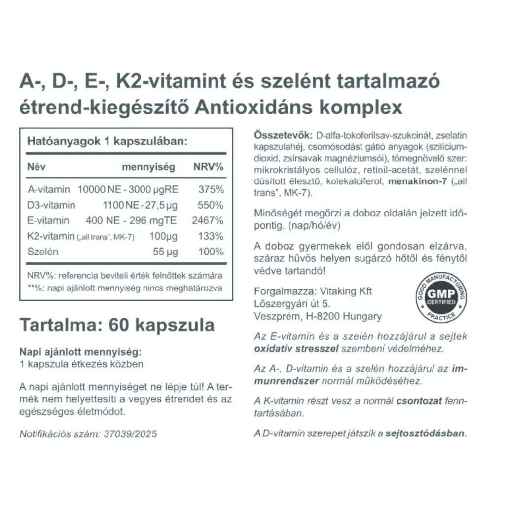 A-, D3-, E- és K2-vitamin, szelénnel kiegészítve, gondosan válogatott összetevők, magas hatóanyag-tartalom.