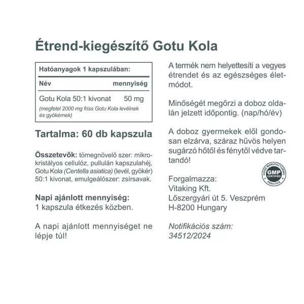 Összetevők: Tömegnövelő szer: mikrokristályos cellulóz, pullalán kapszulahéj, Gotu Kola (Centella asiatica) (gyökér) 50:1 kivonat, emulgeálószer: zsírsavak